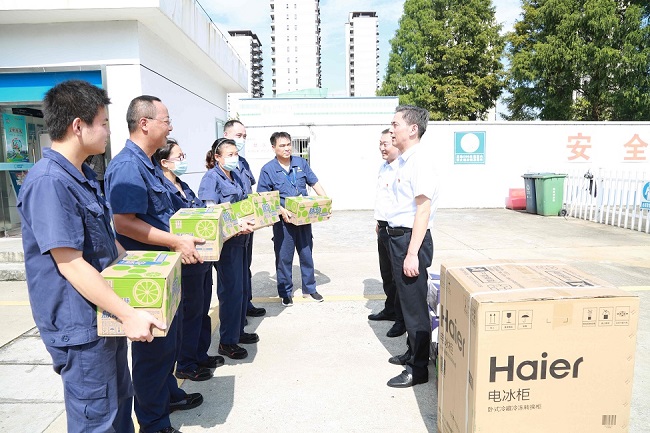 為切實(shí)做好夏季防暑降溫工作,保障高溫期間全體職工的身體健康,確保生產(chǎn)經(jīng)營(yíng)工作順利進(jìn)行,8月11日下午,安慶港華常務(wù)副總楊善俊、工會(huì)主席韓高中一行來(lái)到港華路加氣站、雙井街路段戶(hù)內(nèi)管外移作業(yè)現(xiàn)場(chǎng)及北部新城調(diào)峰站等處,看望慰問(wèn)高溫下始終堅(jiān)守在一線崗位的燃?xì)夤ぷ髡?,并送去冷柜、飲用水和防暑降溫用品,把公司的關(guān)懷送到職工們的心坎里。