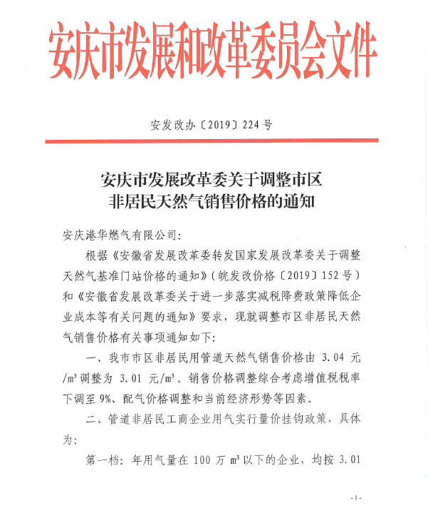 安慶市發(fā)展改革委關于調(diào)整市區(qū)非居民天然氣銷售價格的通知(2019)