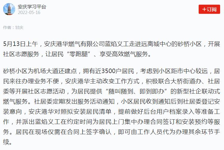 安慶:服務(wù)隨叫隨到 業(yè)務(wù)即到即辦 打造燃?xì)馍鐓^(qū)服務(wù)新模式(轉(zhuǎn)載于學(xué)習(xí)強(qiáng)國(guó))