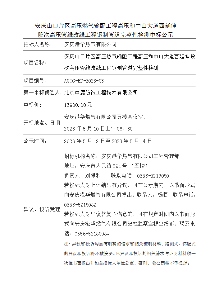 安慶山口片區(qū)高壓燃?xì)廨斉涔こ谈邏汉椭猩酱蟮牢餮由於未胃邏汗芫€改線工程鋼制管道完整性檢測(cè)中標(biāo)公示
