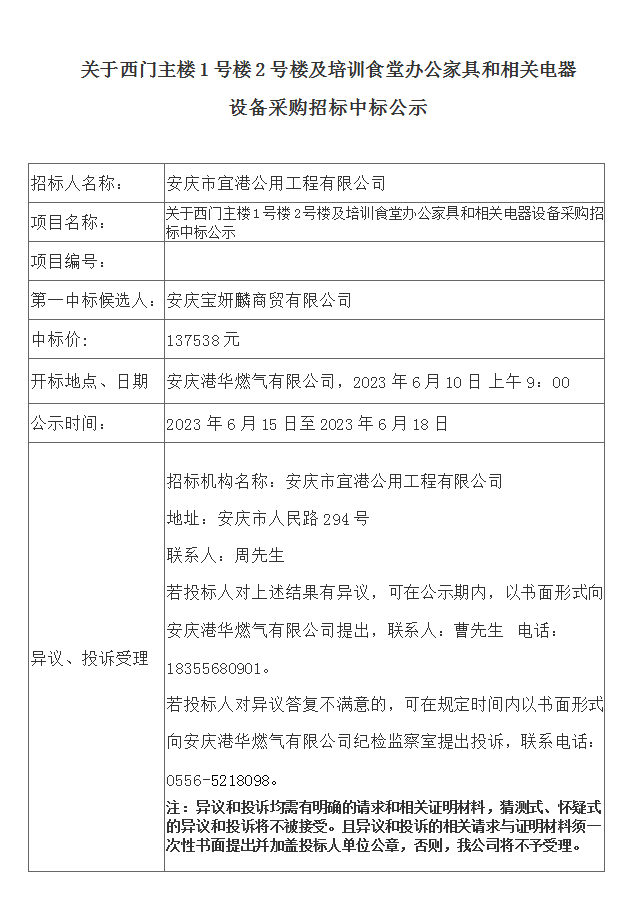 關(guān)于西門主樓1號樓2號樓及培訓(xùn)食堂辦公家具和相關(guān)電器設(shè)備采購招標(biāo)中標(biāo)公示