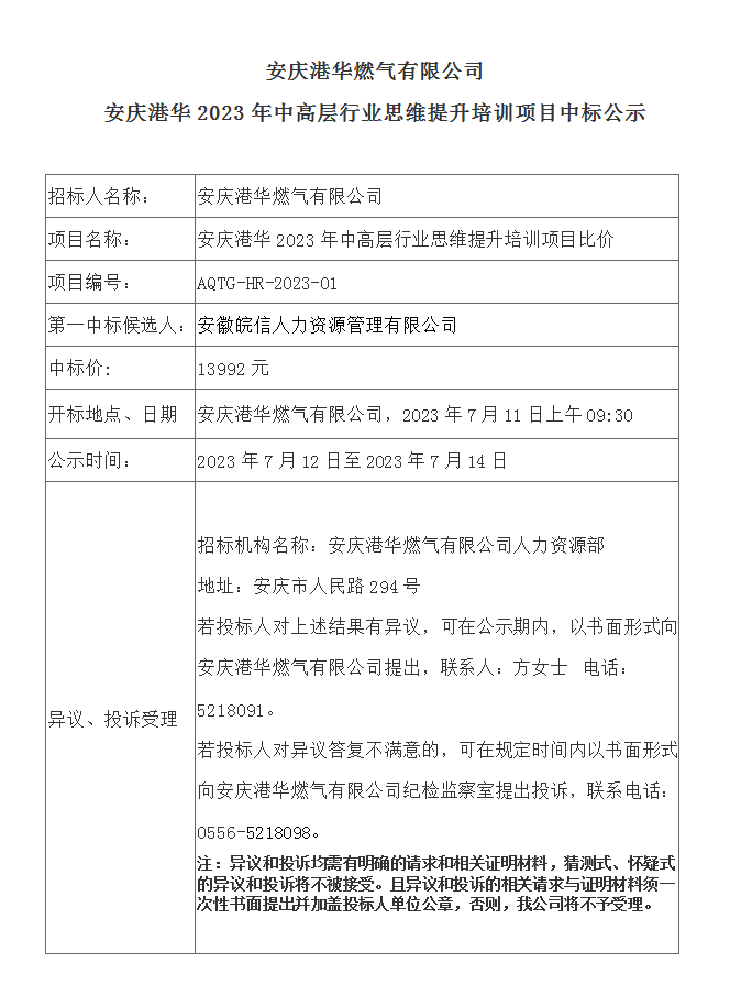 安慶港華2023年中高層行業(yè)思維提升培訓項目中標公示