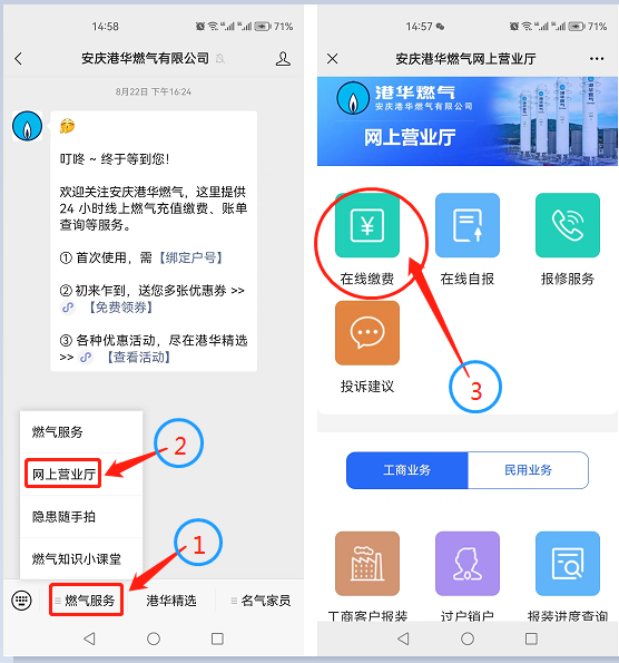微信公眾號(hào):關(guān)注我公司微信公眾號(hào)“安慶港華燃?xì)庥邢薰尽?,點(diǎn)擊“燃?xì)夥?wù)”-“網(wǎng)上營業(yè)廳”,在網(wǎng)上營業(yè)廳中選擇“在線繳費(fèi)”,即可繳納燃?xì)赓M(fèi)或者預(yù)存氣費(fèi)。
