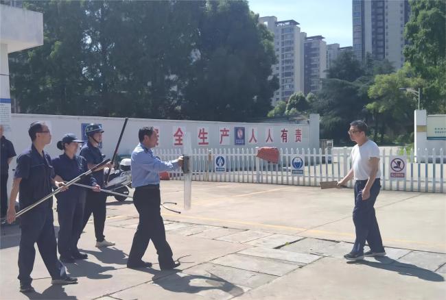 演練模擬了一起發(fā)生在加氣站的歹徒持刀威脅加氣工作人員的惡性事件。站內(nèi)員工發(fā)現(xiàn)嫌疑人員后,手持盾牌及警棍立即上前阻攔,其他人員及時(shí)配合并撥打轄區(qū)民警電話報(bào)警,站內(nèi)員工利用警棍、鋼叉等防衛(wèi)武器配合到達(dá)現(xiàn)場的民警將歹徒制服。