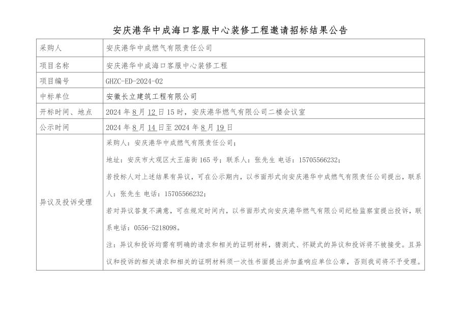 安慶港華中成??诳头行难b修工程邀請招標結(jié)果公告