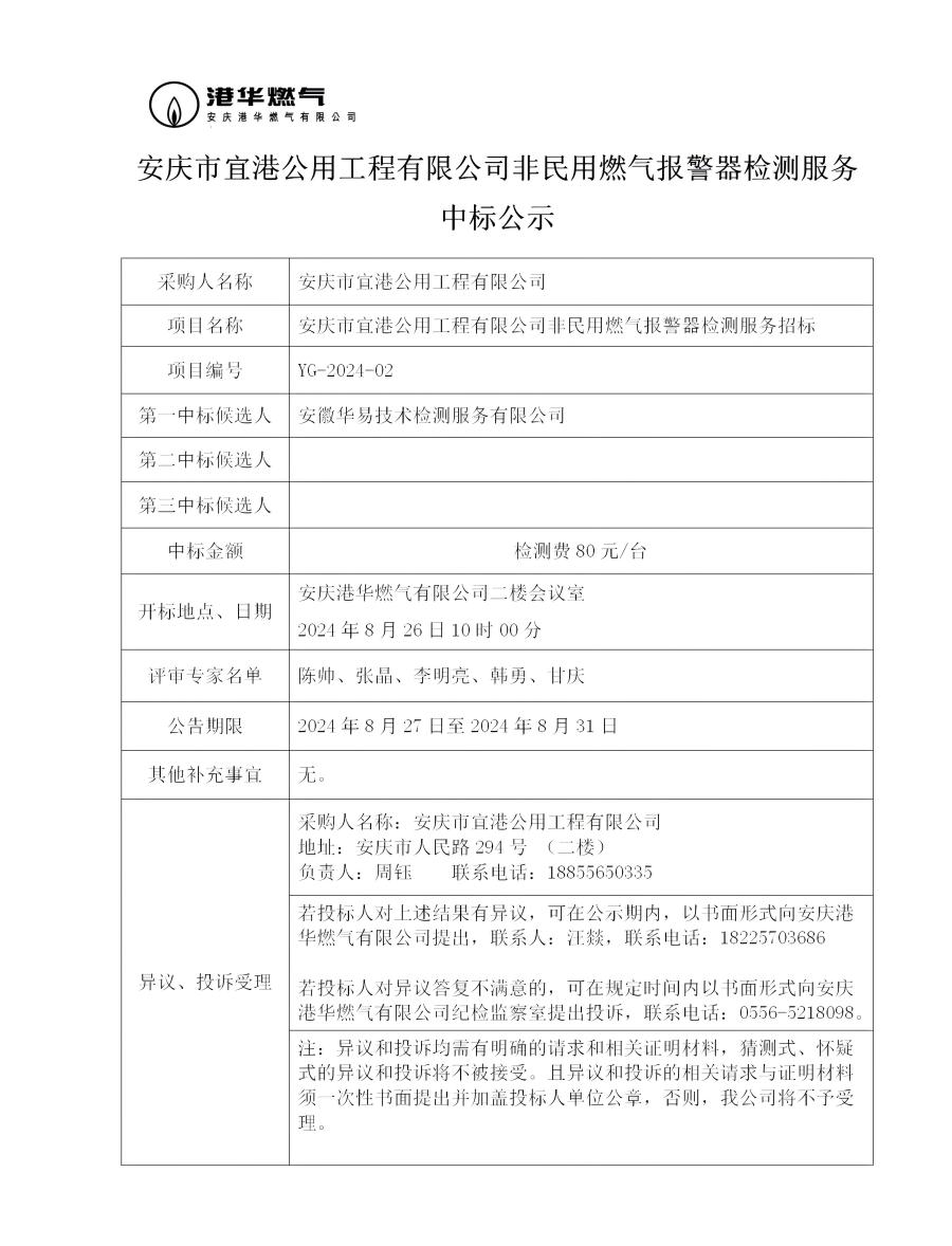 安慶市宜港公用工程有限公司非民用燃氣報警器檢測服務(wù)中標公示