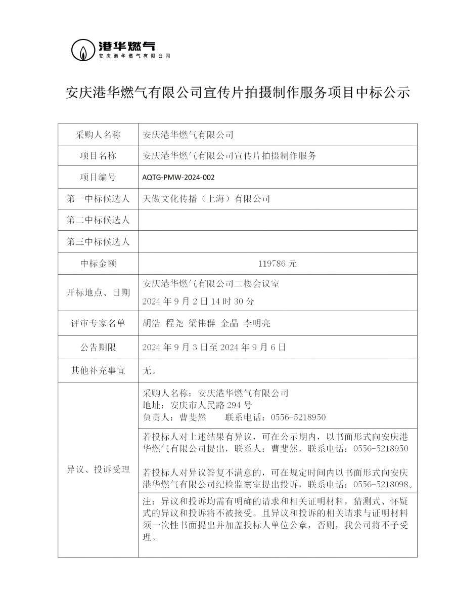 安慶港華燃?xì)庥邢薰拘麄髌臄z制作服務(wù)項目中標(biāo)公示