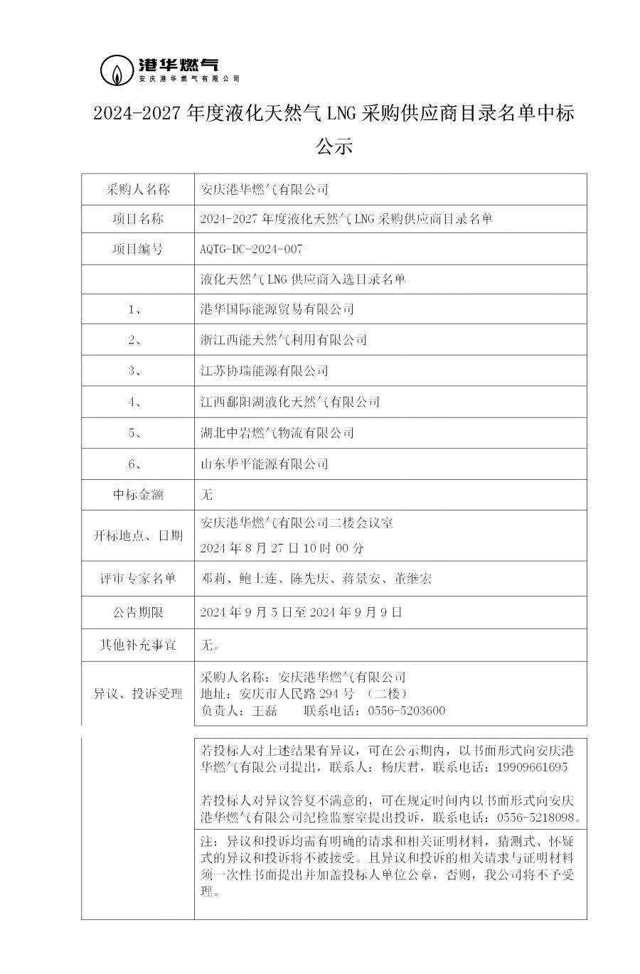 2024-2027年度液化天然氣LNG采購(gòu)供應(yīng)商目錄名單中標(biāo)公示