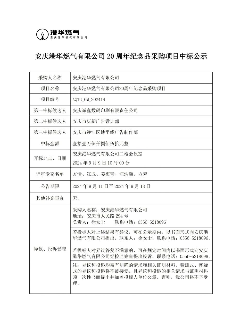 安慶港華燃?xì)庥邢薰?20 周年紀(jì)念品采購項目中標(biāo)公示