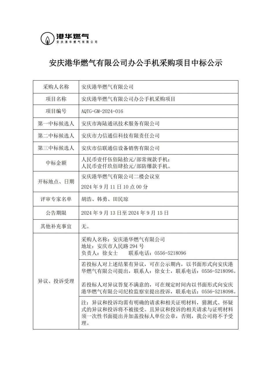 安慶港華燃氣有限公司辦公手機采購項目中標公示