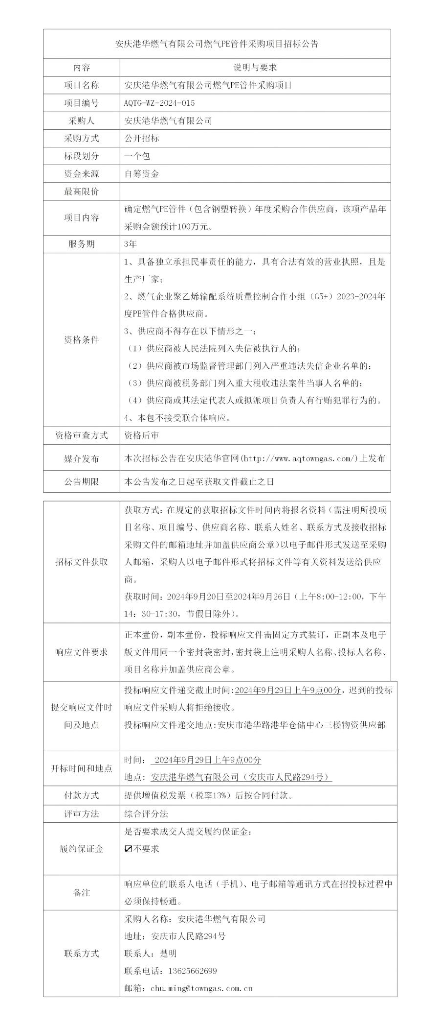 安慶港華燃?xì)庥邢薰救細(xì)釶E管件采購項(xiàng)目招標(biāo)公告