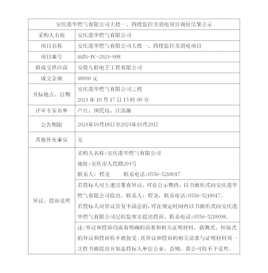 安慶港華燃?xì)庥邢薰敬髽且弧⑺臉潜O(jiān)控及弱電項(xiàng)目詢價(jià)結(jié)果公示