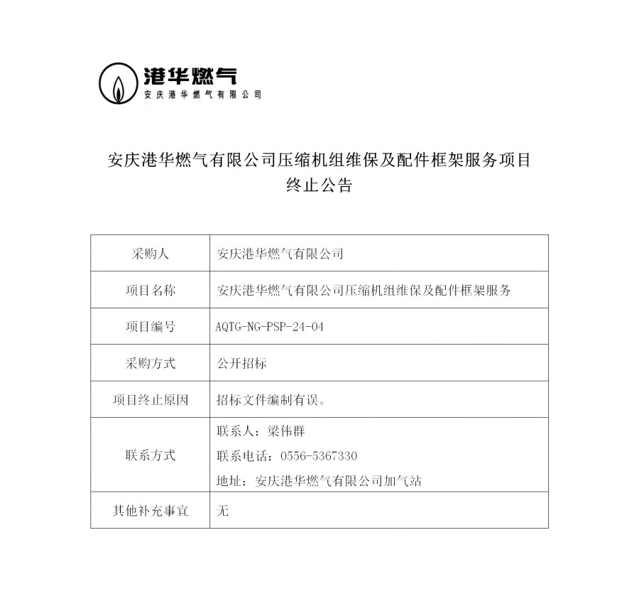 安慶港華燃?xì)庥邢薰緣嚎s機(jī)組維保及配件框架服務(wù)項目終止公告