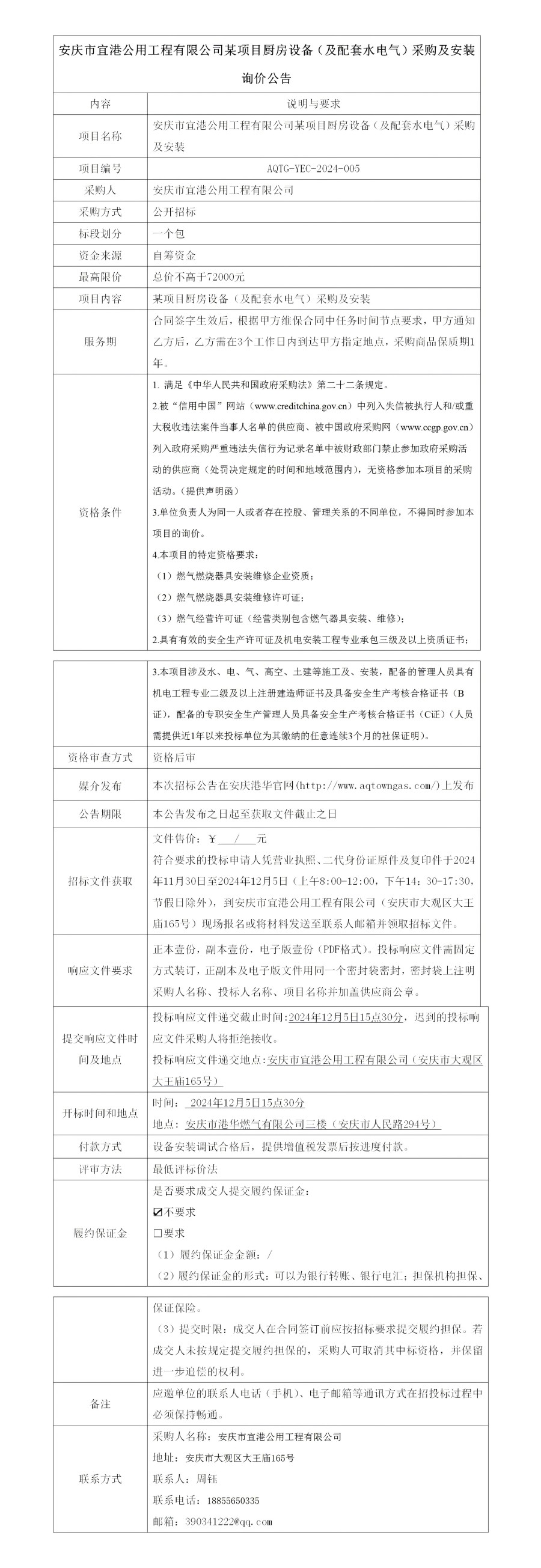 安慶市宜港公用工程有限公司某項(xiàng)目廚房設(shè)備(及配套水電氣)采購(gòu)及安裝詢價(jià)公告