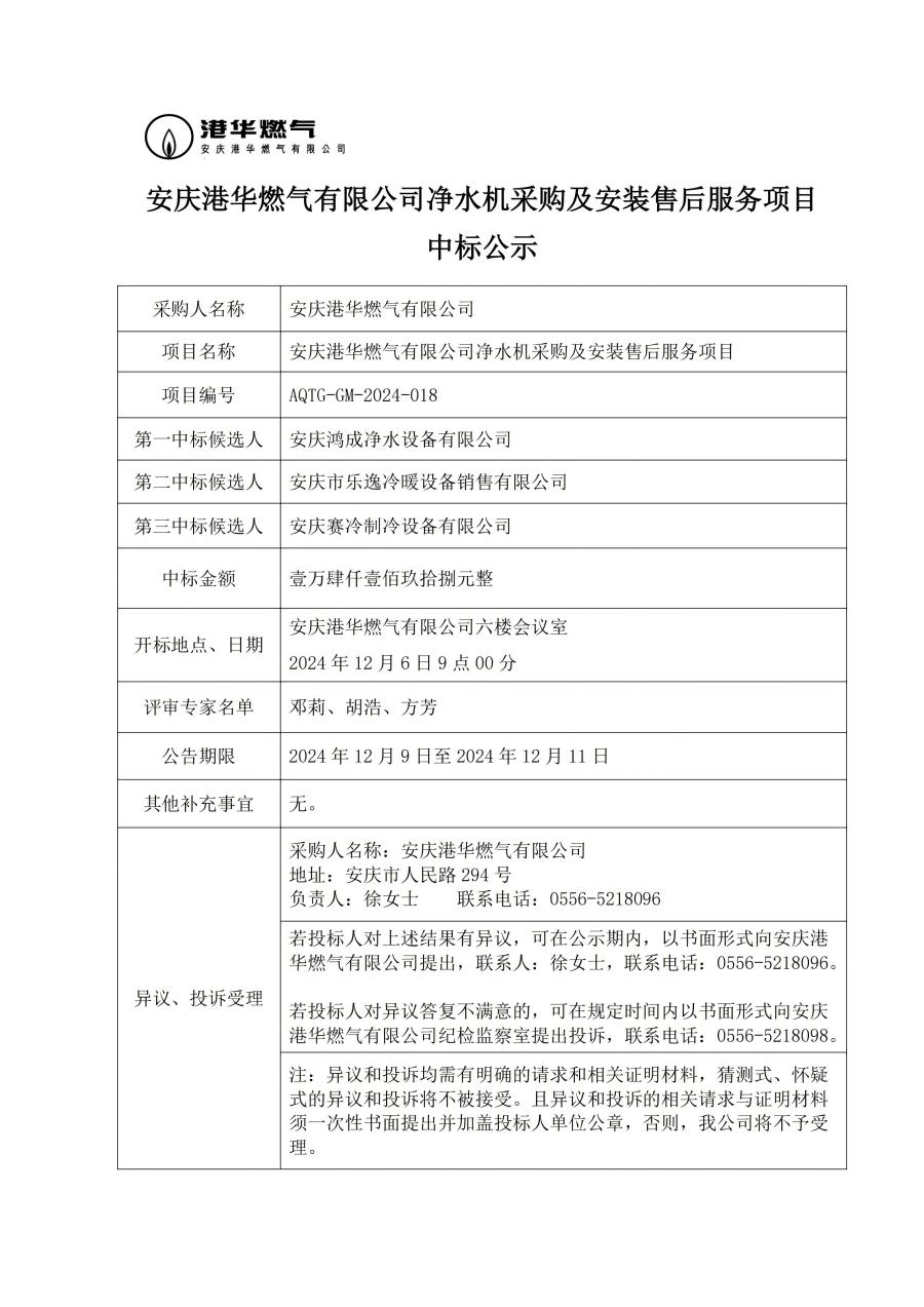 安慶港華燃?xì)庥邢薰緝羲畽C(jī)采購(gòu)及安裝售后服務(wù)項(xiàng)目中標(biāo)公示