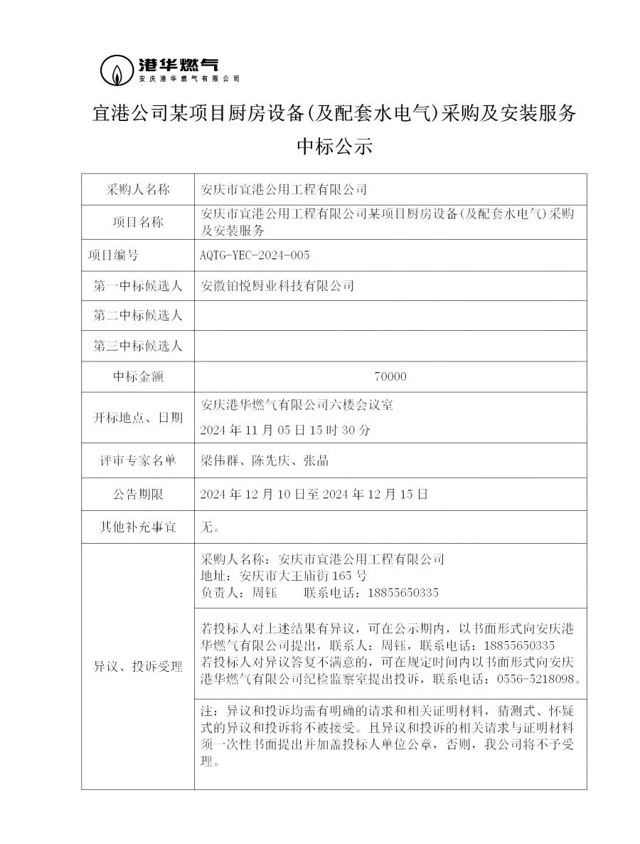 宜港公司某項(xiàng)目廚房設(shè)備(及配套水電氣)采購(gòu)及安裝服務(wù)中標(biāo)公示