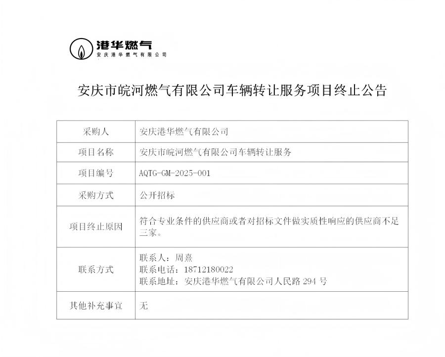 安慶市皖河燃氣有限公司車輛轉讓服務項目終止公告