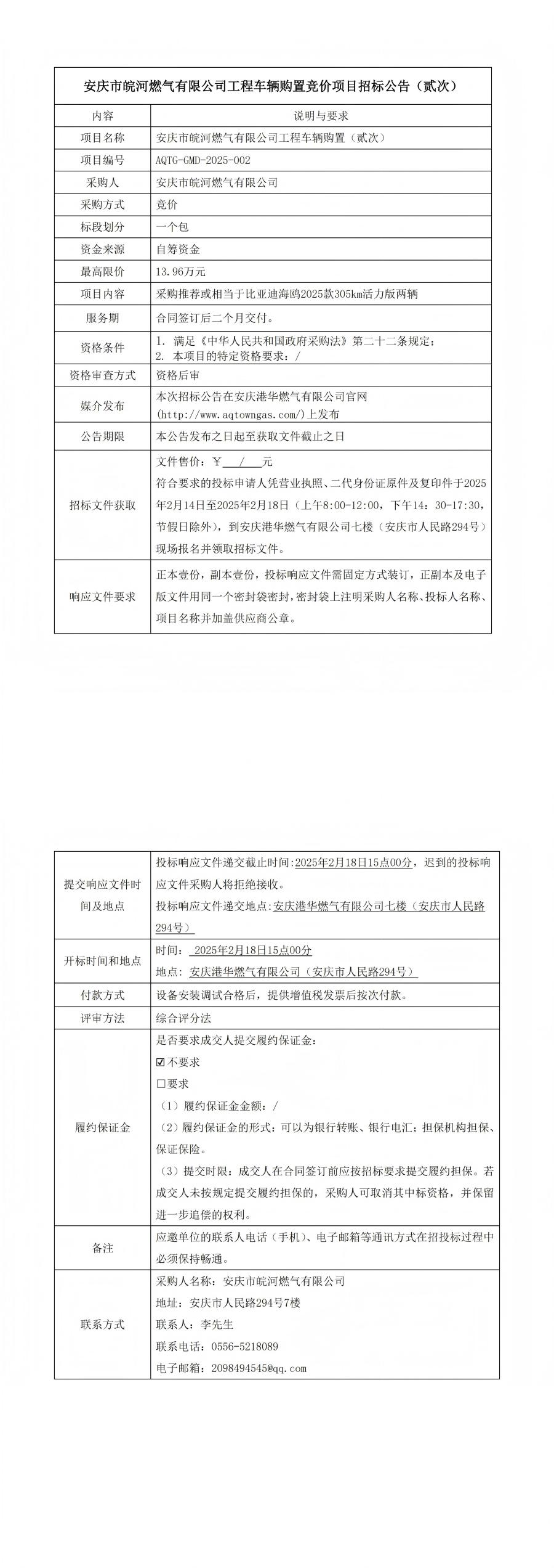 安慶市皖河燃?xì)庥邢薰竟こ誊?chē)輛購(gòu)置競(jìng)價(jià)項(xiàng)目招標(biāo)公告(貳次)