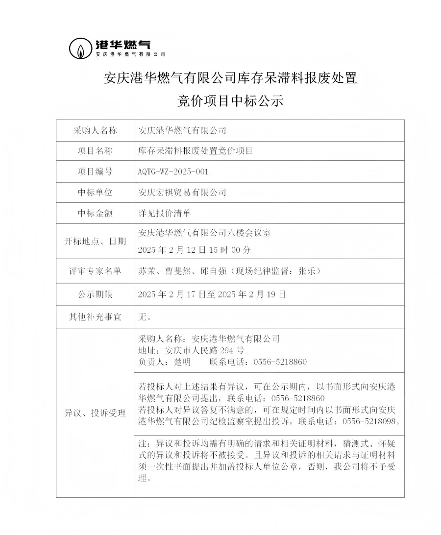 安慶港華燃?xì)庥邢薰編齑娲魷蠄?bào)廢處置競價(jià)項(xiàng)目中標(biāo)公示