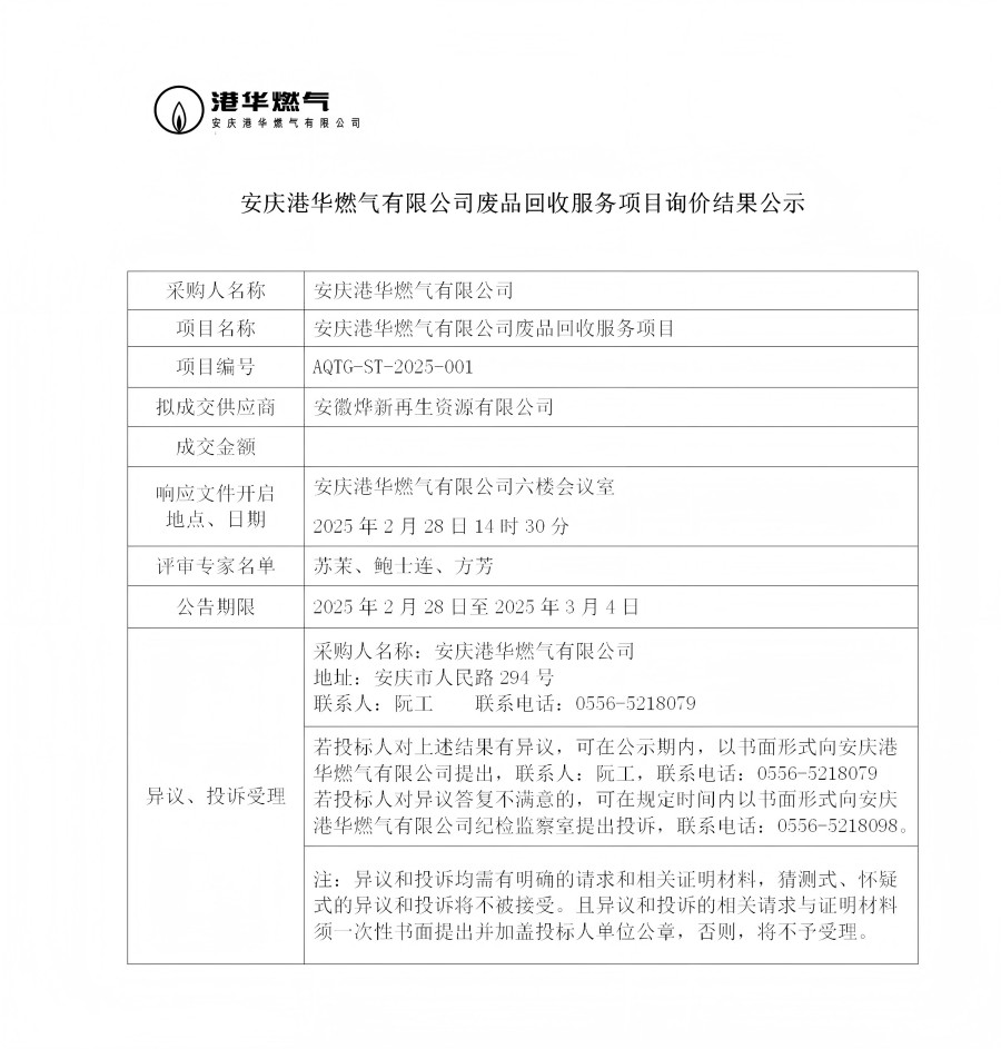 安慶港華燃?xì)庥邢薰緩U品回收服務(wù)項(xiàng)目詢價(jià)結(jié)果公示