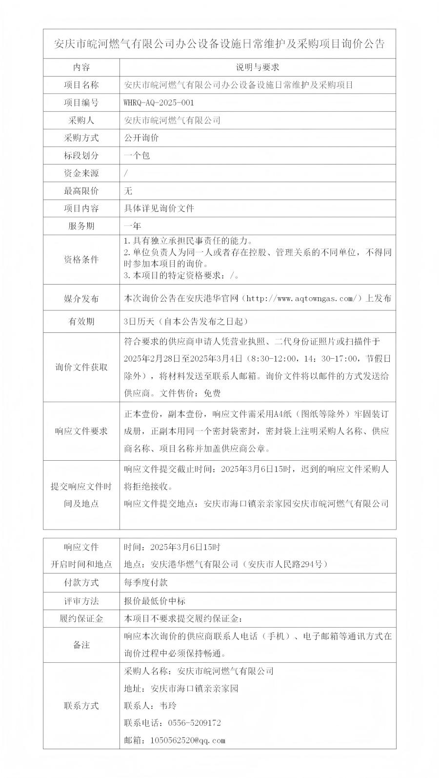 安慶市皖河燃?xì)庥邢薰巨k公設(shè)備設(shè)施日常維護(hù)及采購(gòu)項(xiàng)目詢價(jià)公告
