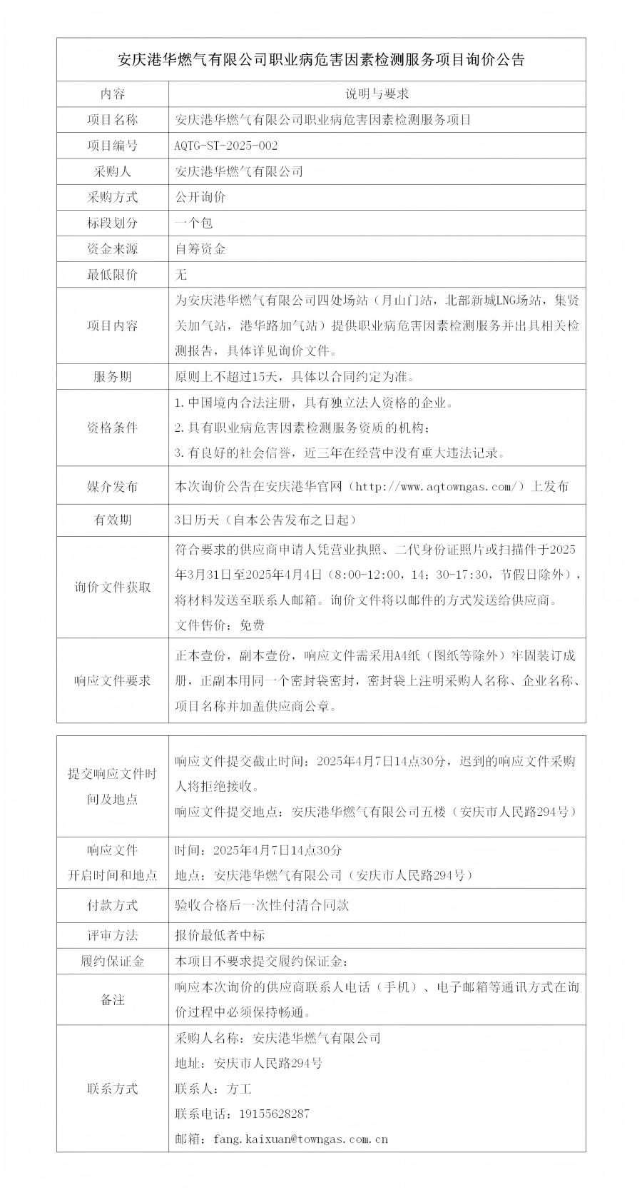 安慶港華燃?xì)庥邢薰韭殬I(yè)病危害因素檢測(cè)服務(wù)項(xiàng)目詢價(jià)公告