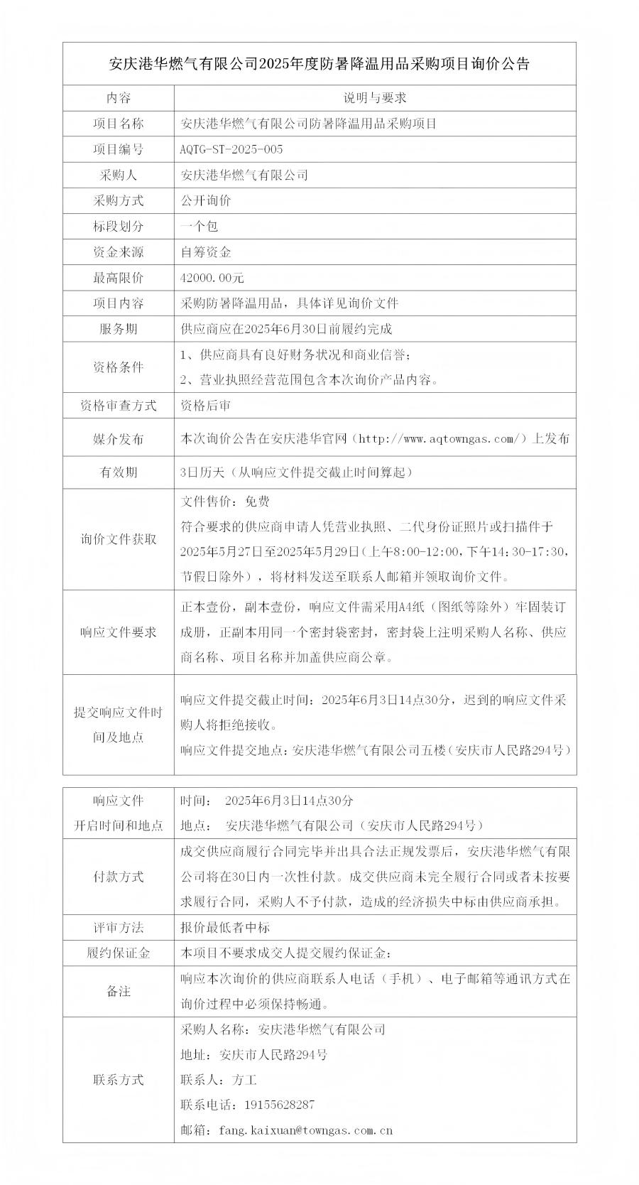 安慶港華燃?xì)庥邢薰?025年度防暑降溫用品采購(gòu)項(xiàng)目詢價(jià)公告