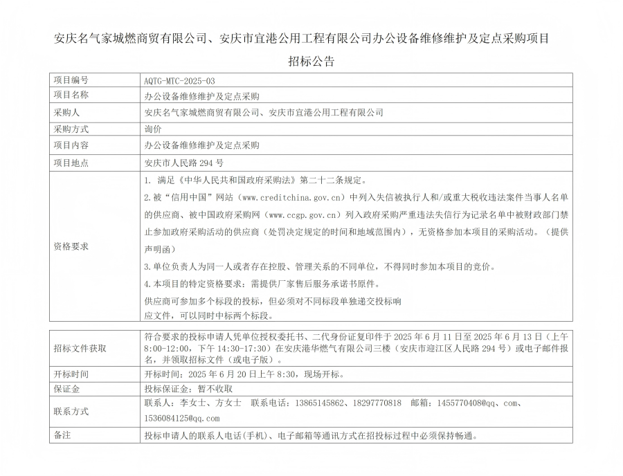 安慶名氣家城燃商貿(mào)有限公司、安慶市宜港公用工程有限公司辦公設(shè)備維修維護及定點采購招標公告