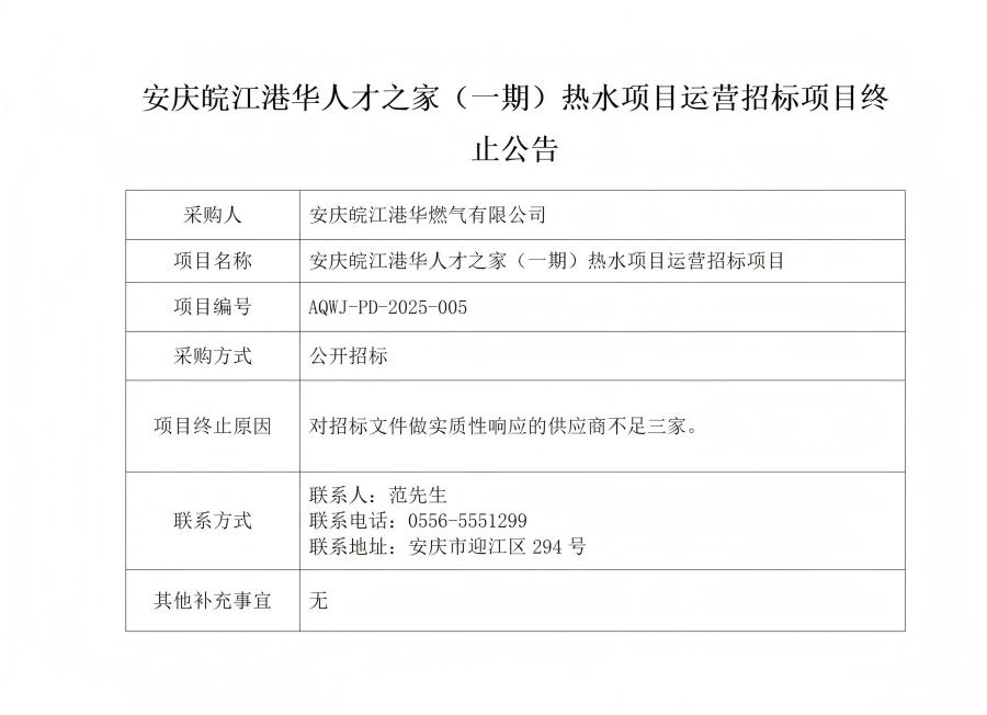 安慶皖江港華人才之家(一期)熱水項(xiàng)目運(yùn)營(yíng)招標(biāo)項(xiàng)目終止公告