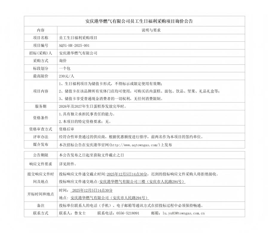 安慶港華燃?xì)庥邢薰締T工生日福利采購(gòu)項(xiàng)目詢價(jià)公告