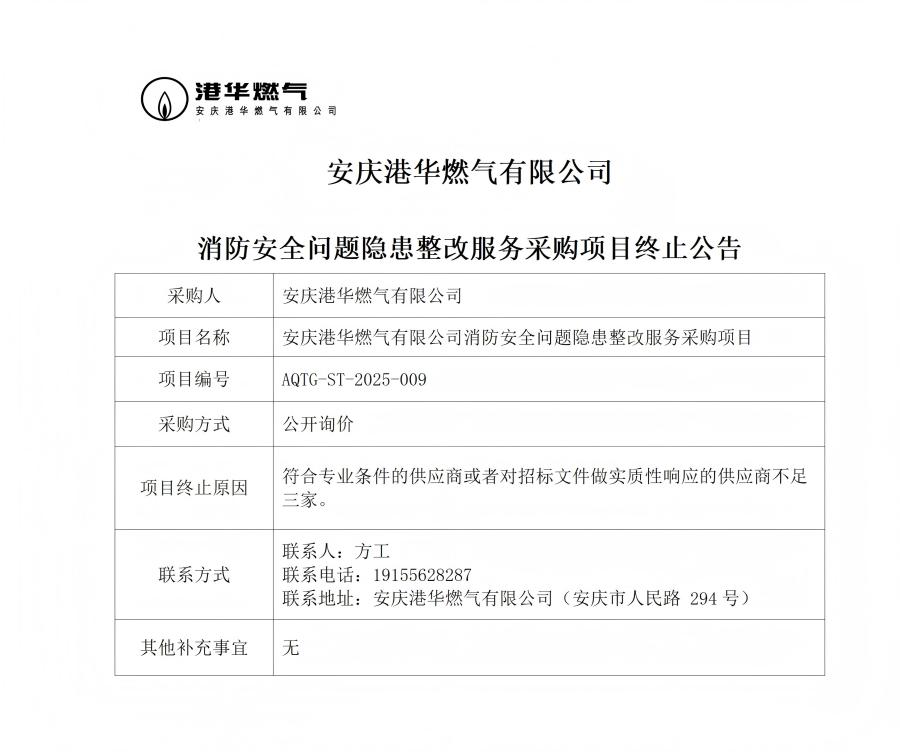 安慶港華燃氣有限公司消防安全問題隱患整改服務采購項目終止公告
