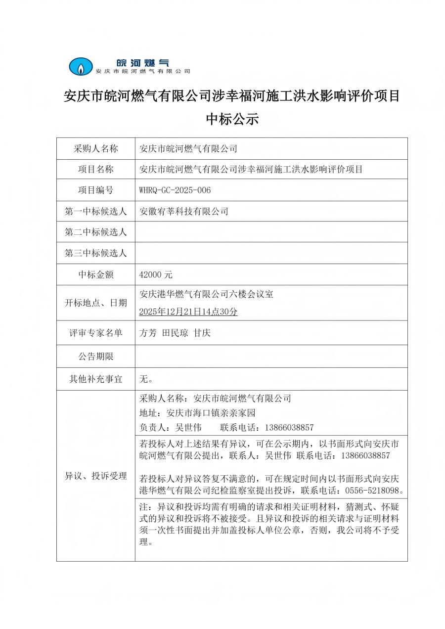 安慶市皖河燃?xì)庥邢薰旧嫘腋:邮┕ず樗绊懺u價項目中標(biāo)公示