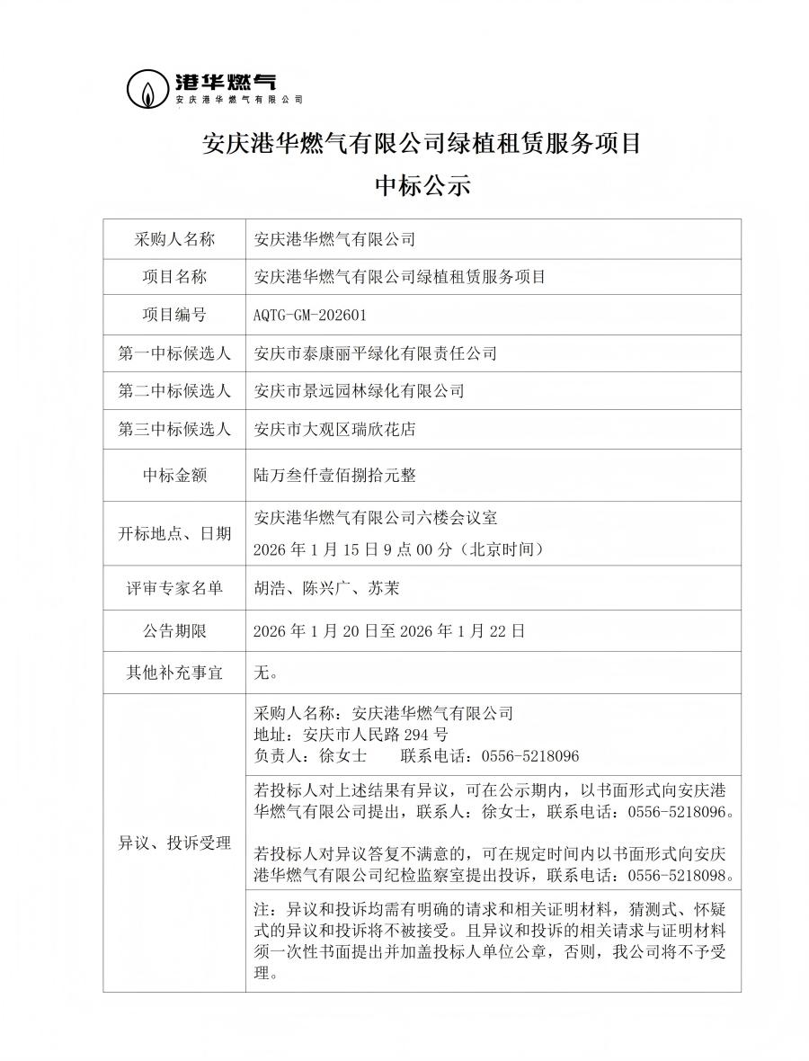 安慶港華燃?xì)庥邢薰揪G植租賃服務(wù)項(xiàng)目中標(biāo)公示