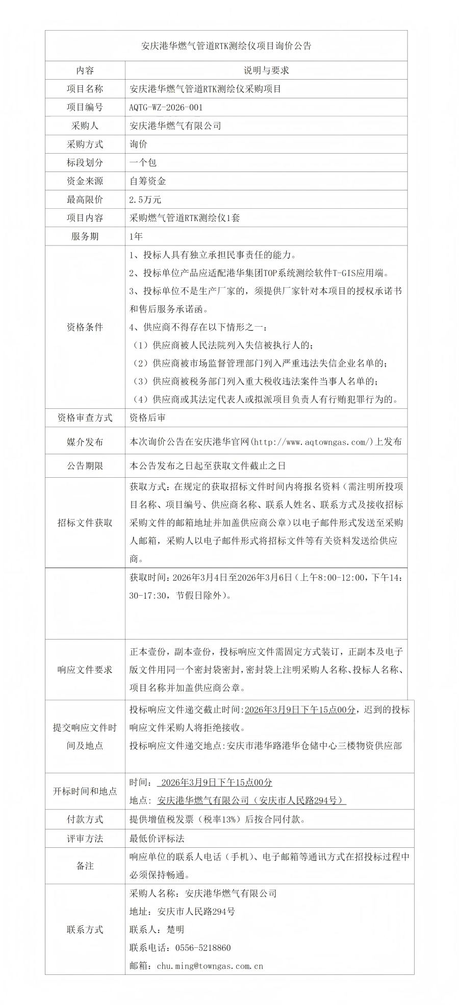 安慶港華燃?xì)夤艿繰TK測(cè)繪儀項(xiàng)目詢價(jià)公告